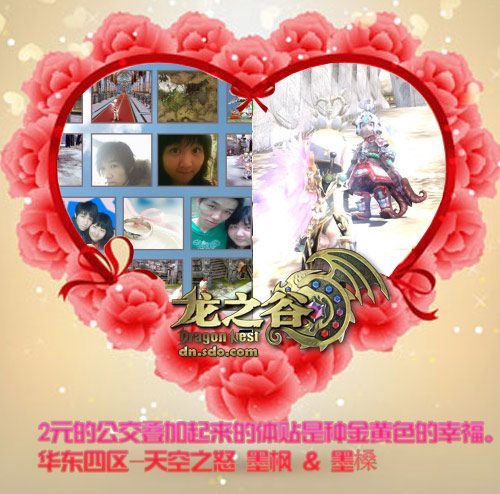 2元的公交叠加起来的体贴是种金黄色的幸福。 华东四区-天空之怒 墨枫 & 墨槡 从新手村到如今满级,我和老公总是尽可能的一起组队,不离不弃,可能我们不是最强力最给力的组合,但是我希望就这么一直走下去。偶尔也因为游戏和生活有小吵,老公的眼睛瞪起来真和牛眼一样大,凶神恶煞的,但很快就好了。