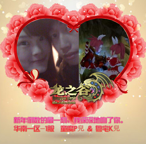 新年倒数的最一刻,我深深地吻了你。 华南一区-1服闪电风暴 童魔P兒 & 粤宅K兒 开心的每一天,让这一年过得特别快。你的打,你的骂,你的脾气,你的纯,哇哈哈,都在我身上留下深深印证。与你每天都是情人节。