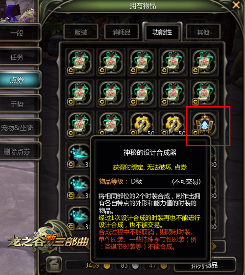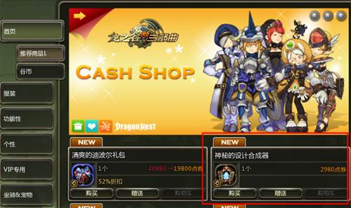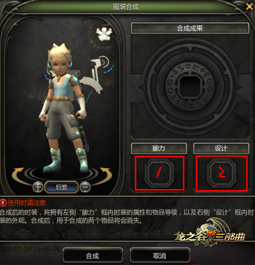 珍藏经典时装,无奈属性已遭淘汰…… 属性牛X,可自己的审美观日渐“升级”,某套时装的外观似乎越来越不对自己的胃口…… 你有这种令人苦恼的问题吗?《龙之谷》70级“大时代”新版本一出,烦恼即刻消除!用来进行时装合成的神器——神秘的设计合成器,终于众望所归,强势加入全新蜕变版本! 进入商城首页的“推荐商品”栏,第一页右侧带有NEW标志的“神秘的设计合成器”,购买后可至角色点券背包的“功能性”标签栏中查收。 右键点击合成器后,将会出现时装合成界面,如下图: |