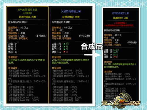 在合成界面中,一共两处可放入需要用于合成的时装:框1和框2。在框1内放入的时装,其各项属性(包括套装属性)以及物品等级(比如B级、C级等)都将体现在合成后的时装中;而在框2内放入的时装,其外观即为合成后的时装外观。最终合成的时装,将在上方成果框中显示。 即:合成成果=框1内时装的属性及物品等级 + 框2内时装的外观设计 下面,让我们来实际演示下具体的操作过程。以“帅气的圣诞节上装”和“火焰的玛格瑙上装”为例: 穿上这件圣诞节气氛的上衣,是不是一下子就让人仿佛回到了铃儿响叮当的那些夜晚呢?天空飘着雪花,耳边传来阵阵欢乐的旋律。但是,一看属性……咳咳,嗯,“时光飞逝,岁月如梭”啊~ 要设计感、更要高属性! 这时候,“神秘的设计合成器”马上就要闪亮出马啦! 在左侧的“能力”框内放入需要提取能力的“火焰的玛格瑙上装”,右侧“设计”框内放入需要提取外观的“帅气的圣诞节上装”,之后,便可以在上方预览合成后的效果:包括属性,等级,和外观。 不过在这里要提醒各位谷迷的是,千万不要把需要提取能力的时装放入“设计”框内,把需要提取外形的时装放入了“能力”框。合成操作不可逆!一旦点击“合成”按钮,就算中途发现了操作失误,也没有可以取消的方式。到时候就……内牛满面了啊…… 当合成后的时装是同一系列(如在“套装物品”处显示“2012年上市的时装套装和特殊物品才能支持套装效果”)的物品后,组成套装效果也完全没问题哦。 今夏混搭,就这么简单!时装合成器,再也不用委屈自己,穿衣态度尽情彰显!在《龙之谷》“大时代”版本中,张扬自己的个性,让自己成为全城注目的焦点吧! 时装合成小贴士: 1、用于合成的两件时装(能力+设计),合成后即消失。 2、合成后的时装名称将与“设计”框内的时装名称相同。 3、主副手武器不支持进行合成。 4、并非所有时装均能进行合成,打开合成器后,无法用于合成的时装,其图标将在点券背包内呈暗色。 5、只能合成相同类型的部件。如,上装与上装合成,下装与下装合成。 |